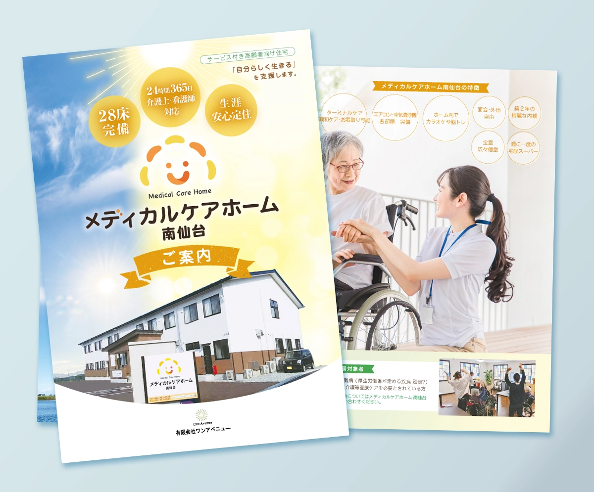 有限会社ワンアベニュー様 メディカルケアホーム南仙台 A4パンフレットを制作いたしました。