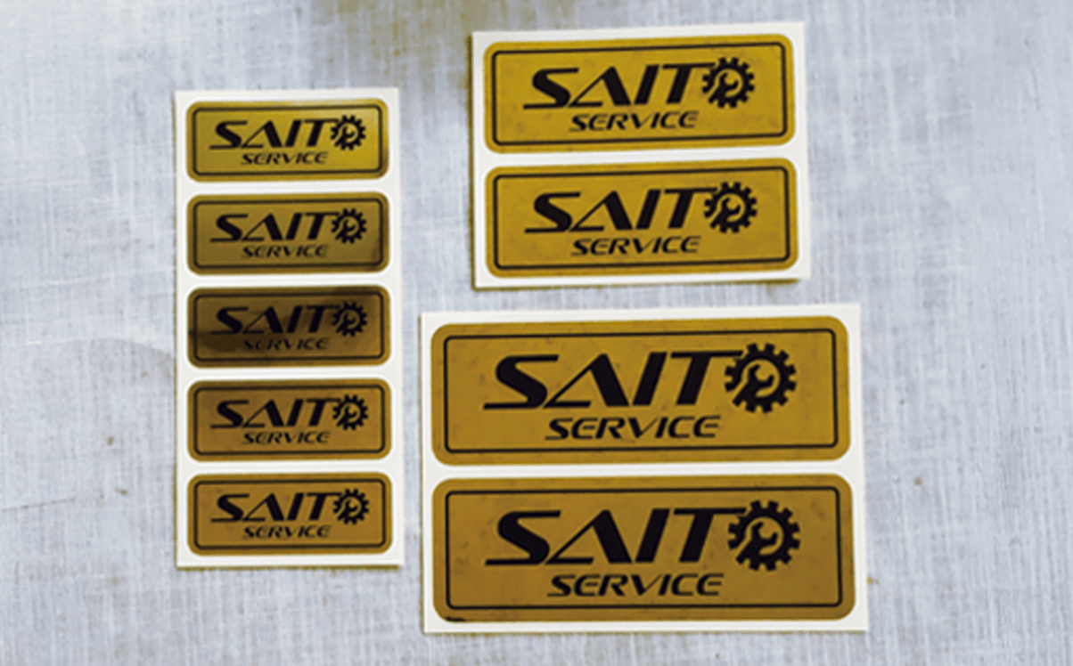 クライアントの要望により金色が良いとのことで、鏡面のようなメタリックな質感と光沢が強いステッカーを制作しました。素材自体が強靭で、破れにくく耐水性があるのが特徴です。